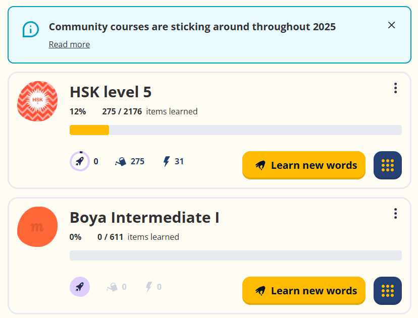 Niegdyś bardzo wartościowa aplikacja dostarczająca ogromu kursów. Świetnie adawała się do powtórek słówek przerabianych na zajęciach. Posiadała kursy z listą słówek z podręczników, takich jak Boya Hanyu czy Developing Chinese. Oferowała również gotowe listy słówek ze wszystkich poziomów HSK.