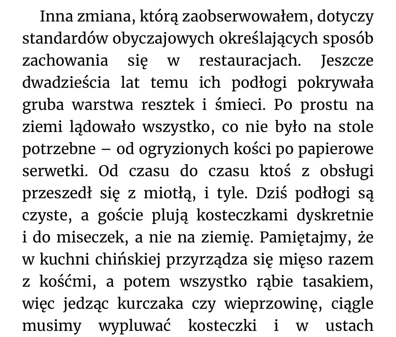 Takich przykładów znajdzie się jeszcze kilka, ale nie jest moją intencją wytykanie nieścisłości. Chiny są przecież ogromne i zmieniają się niezwykle szybko. Nie sposób więc trzymać rękę na pulsie i wiedzieć co się robi i o czym się rozmawia w każdym mieście. Autor zresztą wiele razy pokornie zaznacza, że wiele jego postrzeżeń jest czysto subiektywnych.
